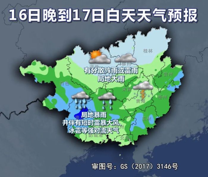 4月17日,广西南部部分地区阴天有小到中雨、局地大雨并伴有短时雷暴大风等强对流天气,其他地区多云到阴天有分散阵雨。最高气温:广西北部25℃~31℃,广西南部25℃~28℃。