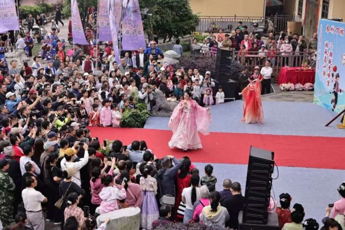 古朴神秘的傩舞祈福表演《令公出山》将传统民俗的魅力展现得淋漓尽致。张家村的村民们身着色彩鲜艳的傩戏服饰,佩戴造型独特的面具,踏着铿锵的鼓点,演绎着古老的祈福仪式,仿佛将人们带回到了遥远的过去,感受着传统文化的厚重与庄严。汉服•十二花神团舞则为现场带来了一抹灵动的国风之美,十二位身着不同花色汉服的“花神”翩翩起舞,衣袂飘飘,宛如从画卷中走出的仙子,将中华传统服饰的优雅与柔美展现得淋漓尽致。