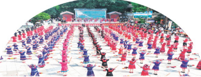 上午9时许,活动在千人舞中拉开帷幕。伴随着欢快的民族乐曲,上千名身着节日盛装的群众在广场上翩翩起舞,瞬间点燃全场气氛。随后,充满趣味与协作精神的竹竿舞和同乐舞轮番登场,竹竿清脆的敲击声与欢快的音乐交织,不少游客也纷纷加入其中,在跳跃间感受民族文化的独特魅力。随后的同乐舞环节,当地群众与游客手拉手围成圆圈,踏着统一的舞步载歌载舞,展现了各族人民亲如一家的和谐画卷。