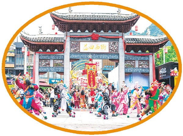 巡游中,阳朔本地非遗——舞龙、牌灯、傩舞等节目纷纷亮相,还有结合《西游记》人物造型的土特产趣味展示。其中,作为阳朔本地非遗的重要代表,傩舞演员们身着古老服饰,戴着面具跳起粗犷有力的舞步,为中外游客送去祝福。古朴神秘的傩舞、刚劲豪迈的英歌舞、雄浑悠远的铜鼓舞,在阳朔山水间展现出中华民族的多元文化魅力。
