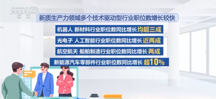 从招聘数据看,新质生产力领域多个技术驱动型行业的职位数增长较快。其中——