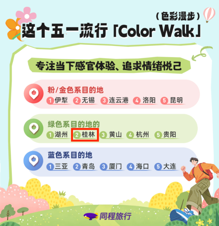 当下爆火的Color Walk(色彩漫步)玩法里,绿色系的广西桂林表现亮眼,其中阳朔搜索热度同比增长48%。与此同时,阳朔还上榜“五一”热门县域旅游目的地TOP3。