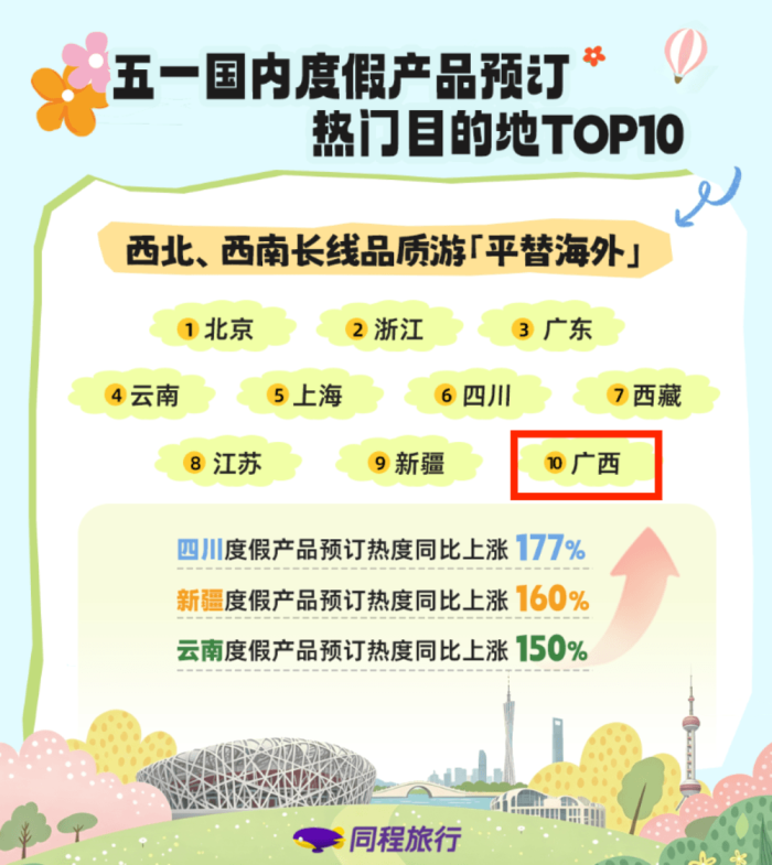 受中东局势及国际航班运力影响,一轮“海外替代游”热潮正在兴起。同程旅行最新报告显示,广西跻身“五一”国内度假产品预定热门目的地TOP10,和云南、四川、新疆等西南、西北的热门目的地接住了这波流量。