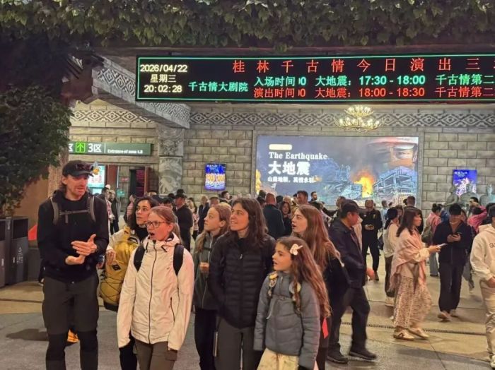 4月22日,桂林千古情景区迎来超500人的外国旅行团,现场瞬间火爆!来自德国、意大利等国家的游客欢聚一堂,逛景区、看演出、体验民俗,全程尖叫不停。震撼的舞台效果与浓郁的民族风情深深吸引了外国友人,大家纷纷拍照打卡,流连忘返。