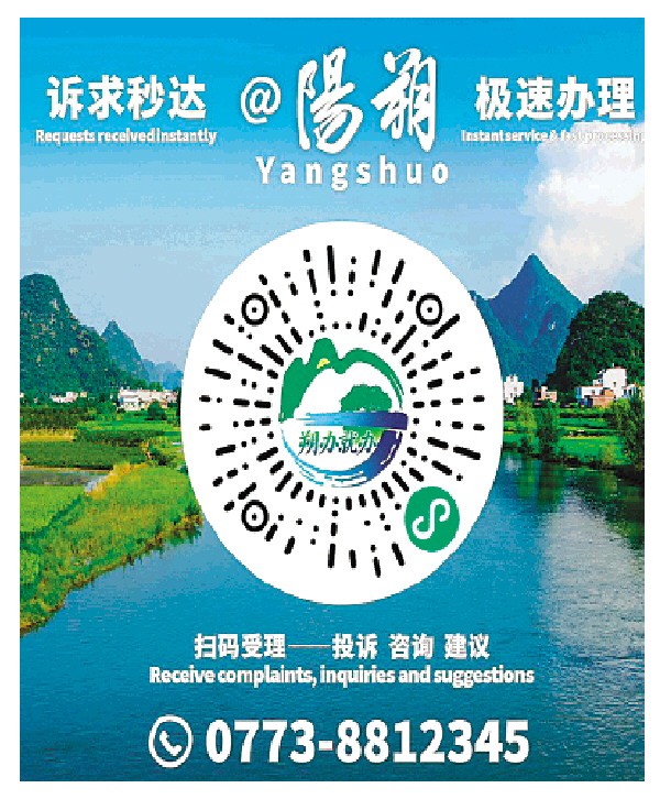 4月23日上午,记者在桂林千古情景区游客中心看到,首批“朔办就办”宣传海报已张贴到位。海报以绿、白、蓝为主色调,以阳朔青山绿水为背景,清晰标注“扫码受理—投诉、咨询、建议”双语服务标识,并同步公示服务热线:0773-8812345。