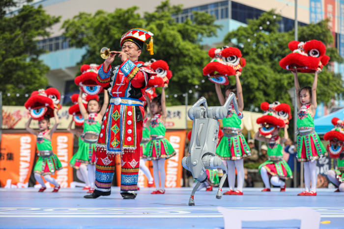 当天,活动在滨江广场拉开帷幕。伴随着欢快的音乐,舞台文艺表演区率先点燃全场热情。开场舞《古韵灵川等你来》以优美的身姿和浓郁的地方特色,向八方来客发出诚挚邀请;少儿表演唱《山歌长出小脚丫》用稚嫩的童声唱响非遗传承的新希望;《唢呐醒狮·科技国潮》更是创意十足,将传统醒狮、唢呐演奏与现代电子乐巧妙融合,还创新性加入灵动的机器人、憨态可掬的机器狗同台互动,传统民俗与前沿科技碰撞出别样火花,引得台下观众阵阵欢呼、掌声不断。经典赶歌圩环节,《木棉花开》《壮家阿哥》《盘歌》等原生态山歌韵味悠长,搭配《迎》《九州同》等民族舞蹈,生动展现了各族群众手足情深、共庆佳节的温馨画面。