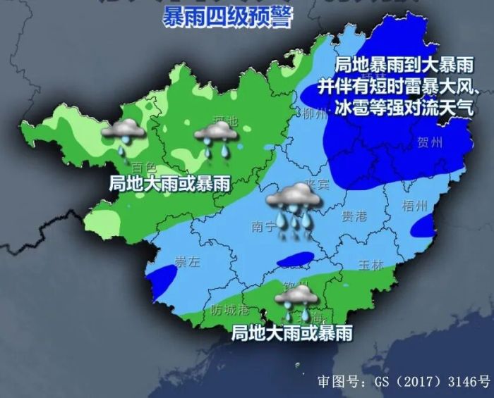 今天晚上,梧州、贵港、南宁、崇左、玉林、北海、钦州、防城港等市有大雨到暴雨、局地大暴雨并伴有短时雷暴大风、冰雹等强对流天气,其它地区有小到中雨、局地大雨。