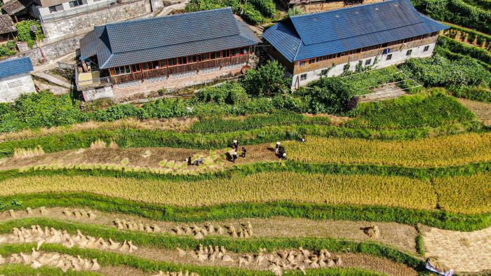 9月19日,广西桂林市灵川县兰田瑶族乡梯田迎来水稻集中收割期,金黄稻浪铺满山间,村民身着民族服饰忙碌于收割、脱粒、晒谷,呈现一派丰收景象。当地海拔高、地形复杂,仍保留耕牛犁田、手工收割等传统方式,坚持施用农家肥,保障米质香软可口。政府通过完善设施、推广良种、发展旅游,推动梯田保护与乡村振兴,让古老梯田焕发新生机。2025-09-22 16:24:00