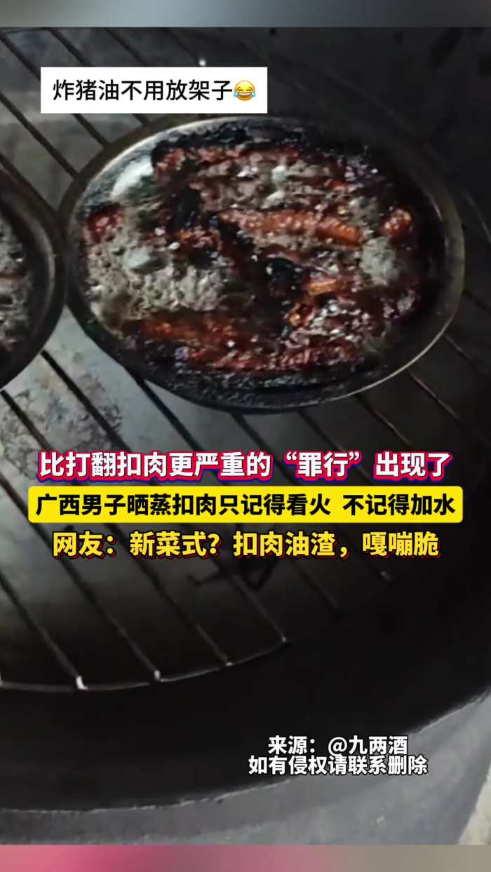 比打翻扣肉更严重的“罪行”出现了!广西男子晒蒸扣肉只记得看火,不记得加水!网友:新菜式?扣肉油渣,嘎嘣脆