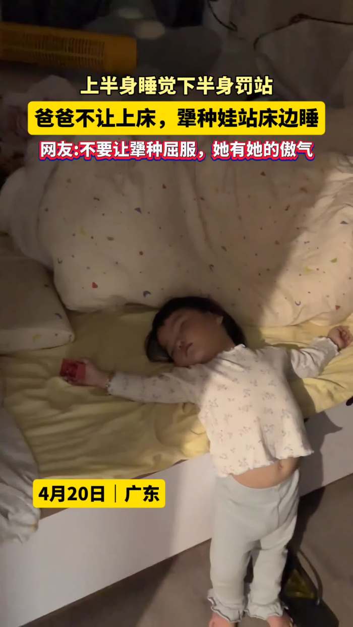 上半身睡觉下半身罚站!爸爸不让上床,犟种娃站床边睡。网友:不要让犟种屈服,她有她的傲气