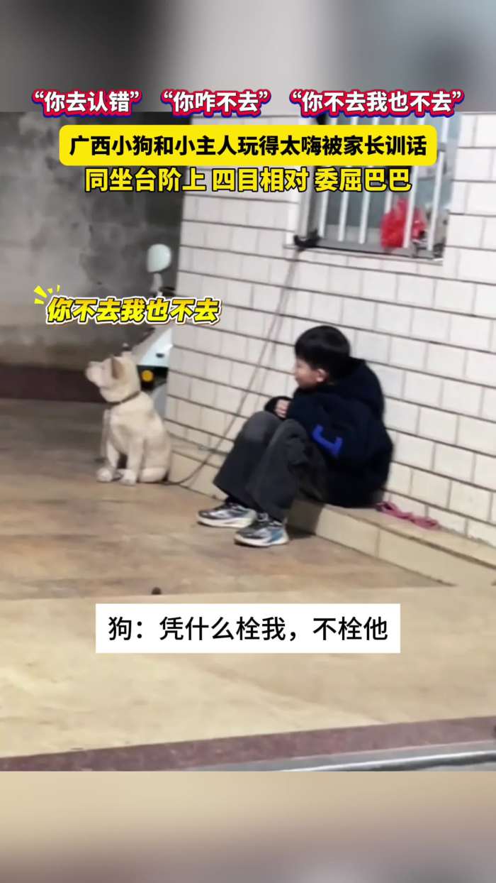 “你去认错”“你咋不去”“你不去我也不去”!广西小狗和主人玩得太嗨被家长训话,同坐台阶上,四目相对委屈巴巴