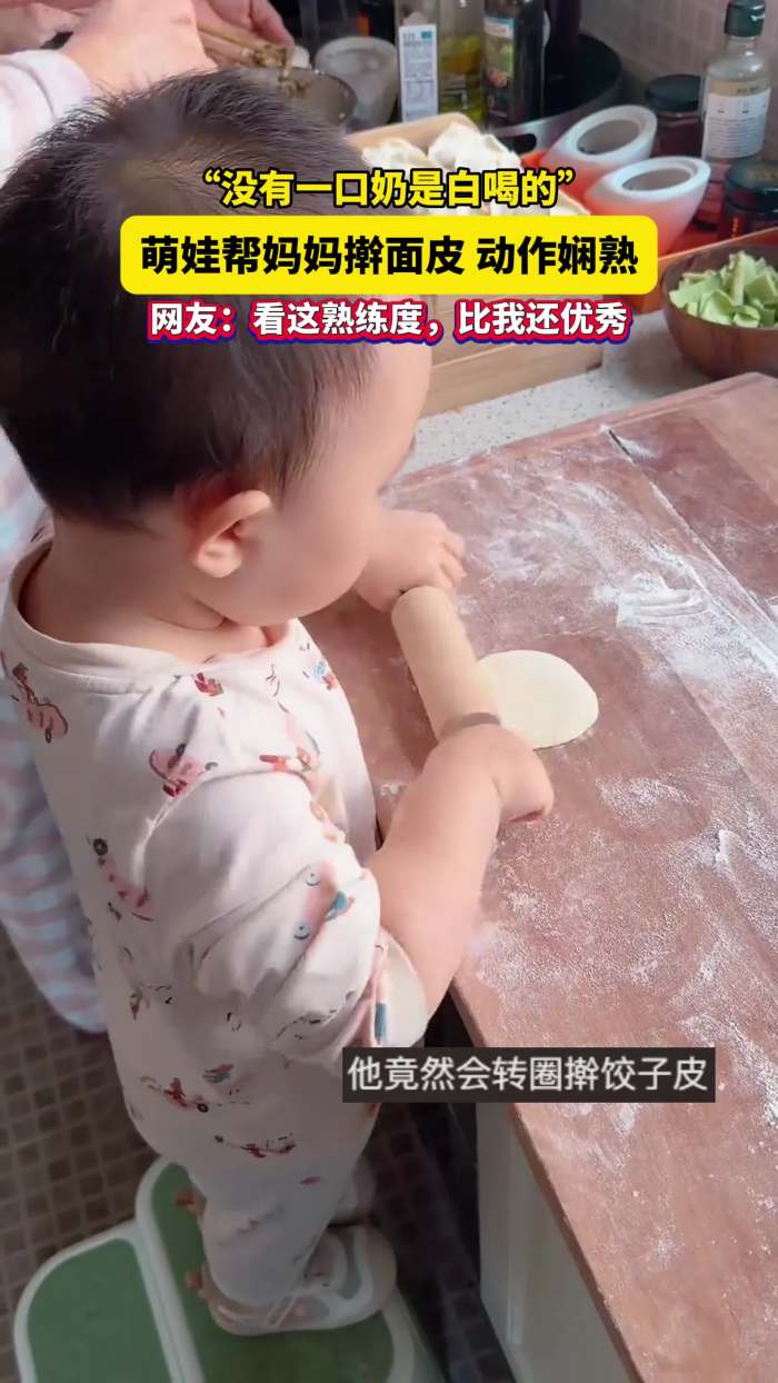 没有一口奶是白喝的!萌娃帮妈妈擀面皮动作娴熟!网友:看这熟练度,比我还优秀