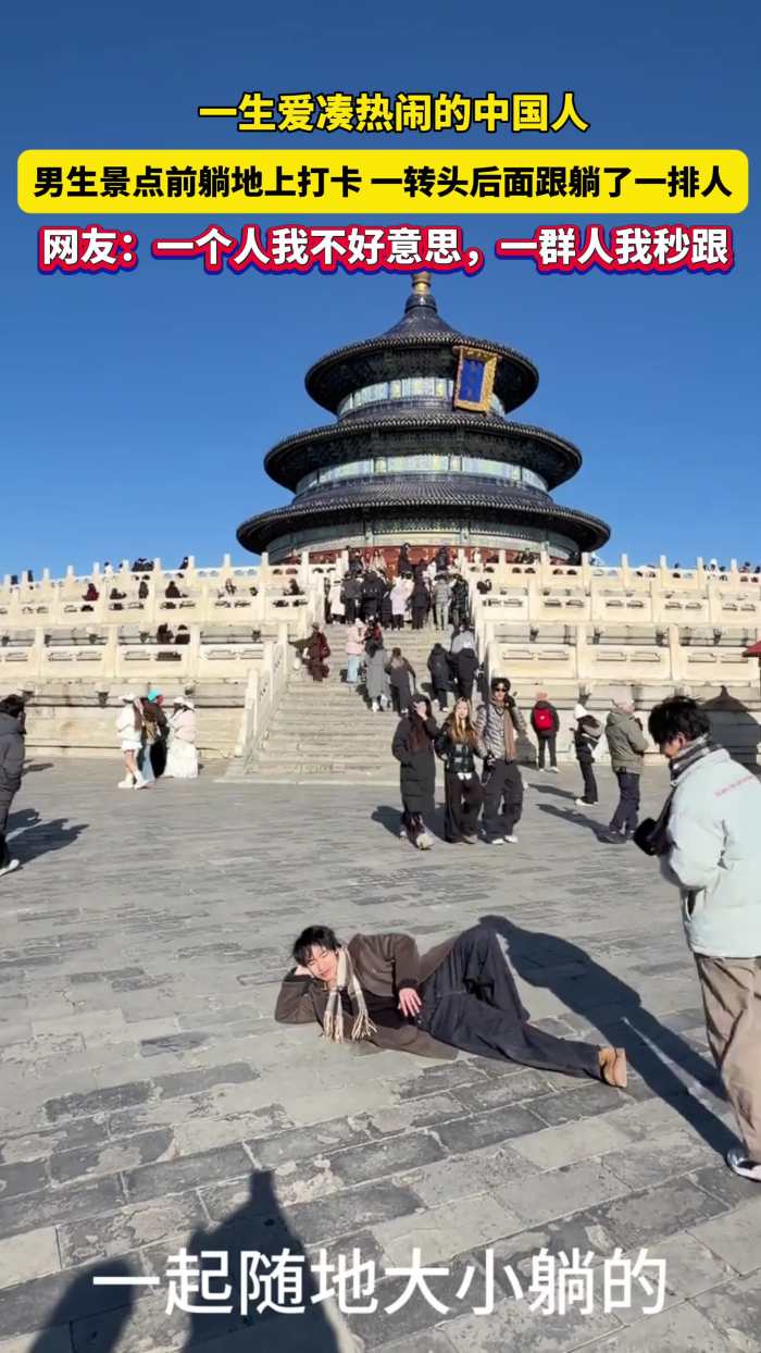 一生爱凑热闹的中国人!男生景点前躺地上打卡,一转头后面跟躺了一排人!网友:一个人我不好意思,一群人我秒跟