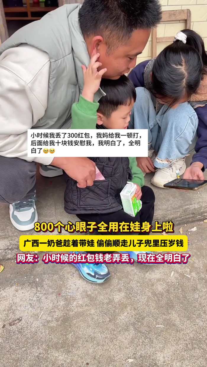 800个心眼子全用在娃身上啦!广西一奶爸趁着带娃偷偷顺走儿子兜里的压岁钱!网友:小时候老弄丢红包,现在全明白了
