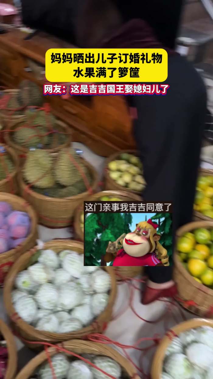 • 妈妈晒出儿子订婚礼物,水果满了箩筐。网友:这是吉吉国王娶媳妇儿了?