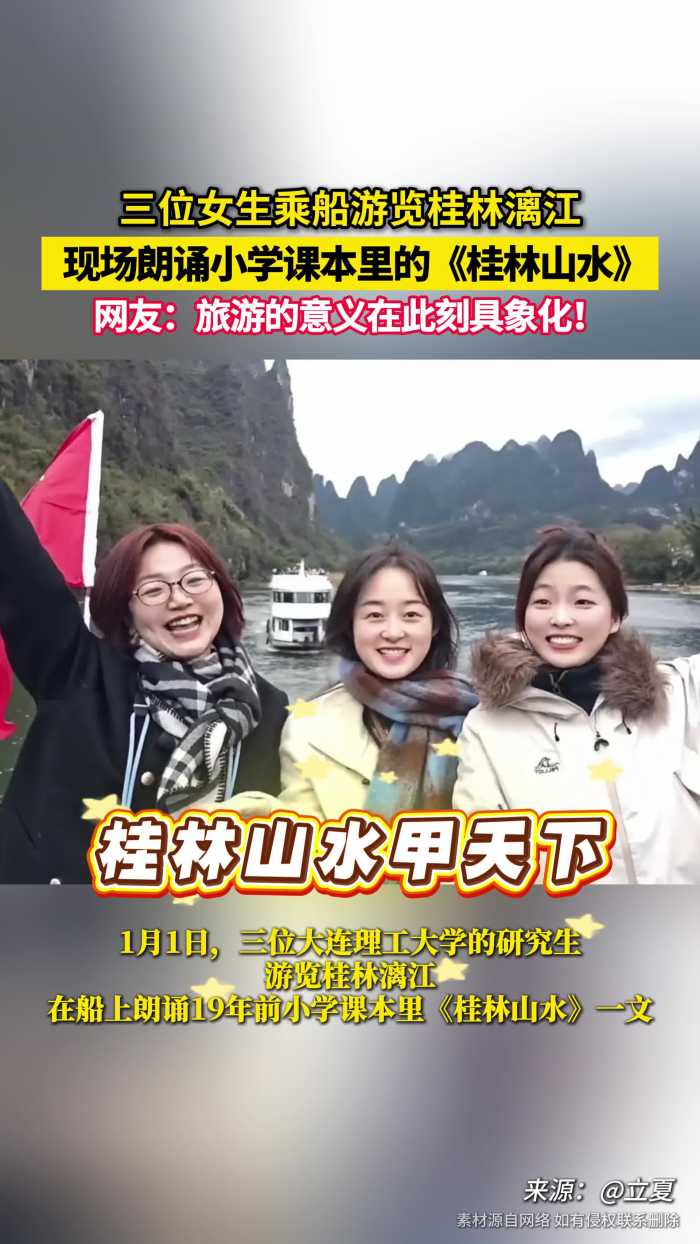 三位女生乘船游览桂林漓江,现场朗诵19年前小学课本里《桂林山水》一文
