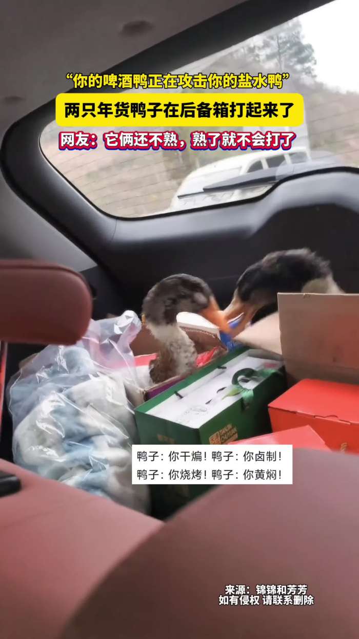 “你的啤酒鸭正在攻击你的盐水鸭”两只年货鸭子在后备箱打起来了!网友:它俩还不熟,熟了就不会打了