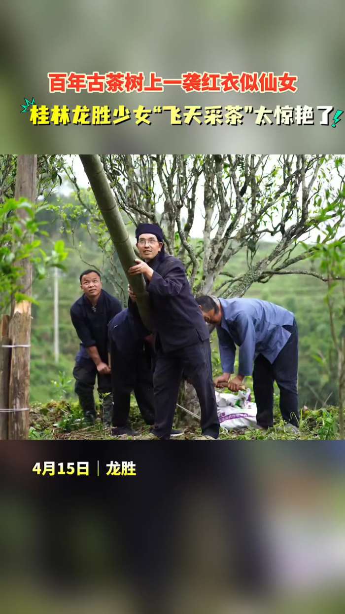 百年古茶树上一袭红衣似仙女,桂林龙胜少女“飞天采茶”太惊艳了(放桂在生活)