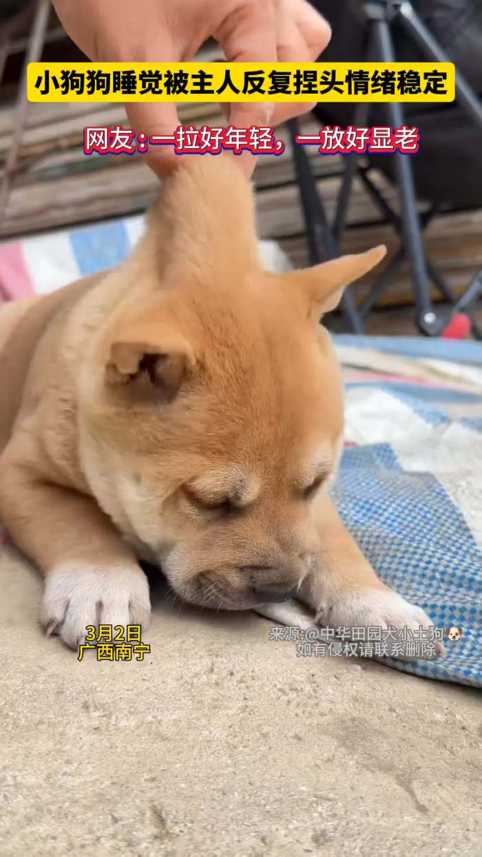 小狗狗睡觉被主人反复捏头情绪稳定 网友:一拉好年轻,一放好显老