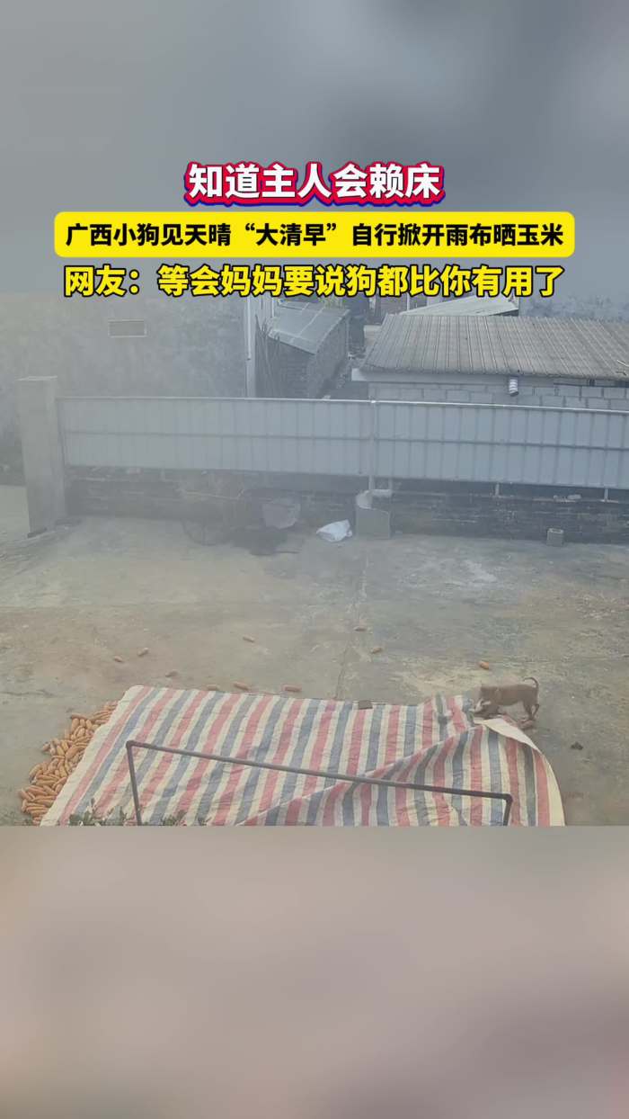 知道主人会赖床!广西小狗见天晴,“大清早”自行掀开雨布晒玉米!网友:等会妈妈要说狗都比你有用了