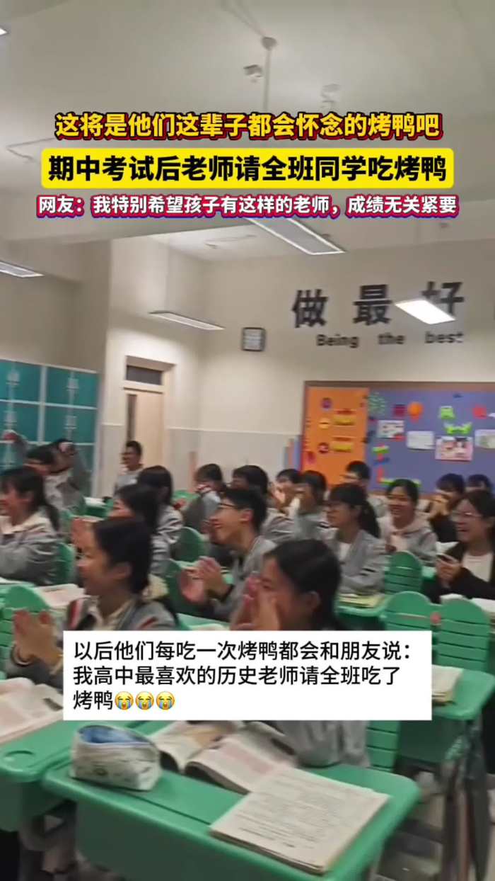 这是他们这辈子都会怀念的烤鸭吧!期中考试后老师请全班同学吃烤鸭!网友:特别希望我的孩子也能遇到这样的老师