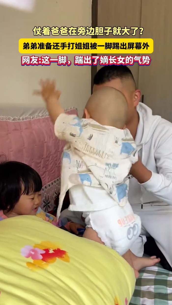 仗着爸爸在旁边胆子就大了? 弟弟准备还手打姐姐被一脚踢出屏幕外 ,网友:这一脚,踹出了嫡长女的气势