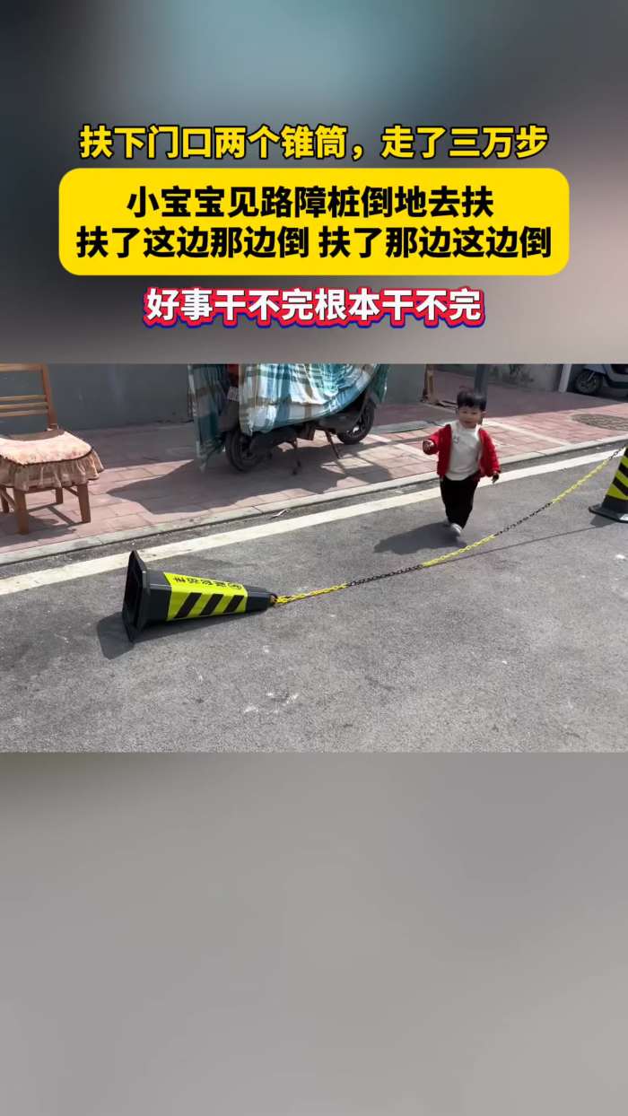 好事干不完根本干不完,小宝宝见路障桩倒地去扶 扶了这边那边倒扶了那边这边倒,扶下门口两个锥筒,走了三万步