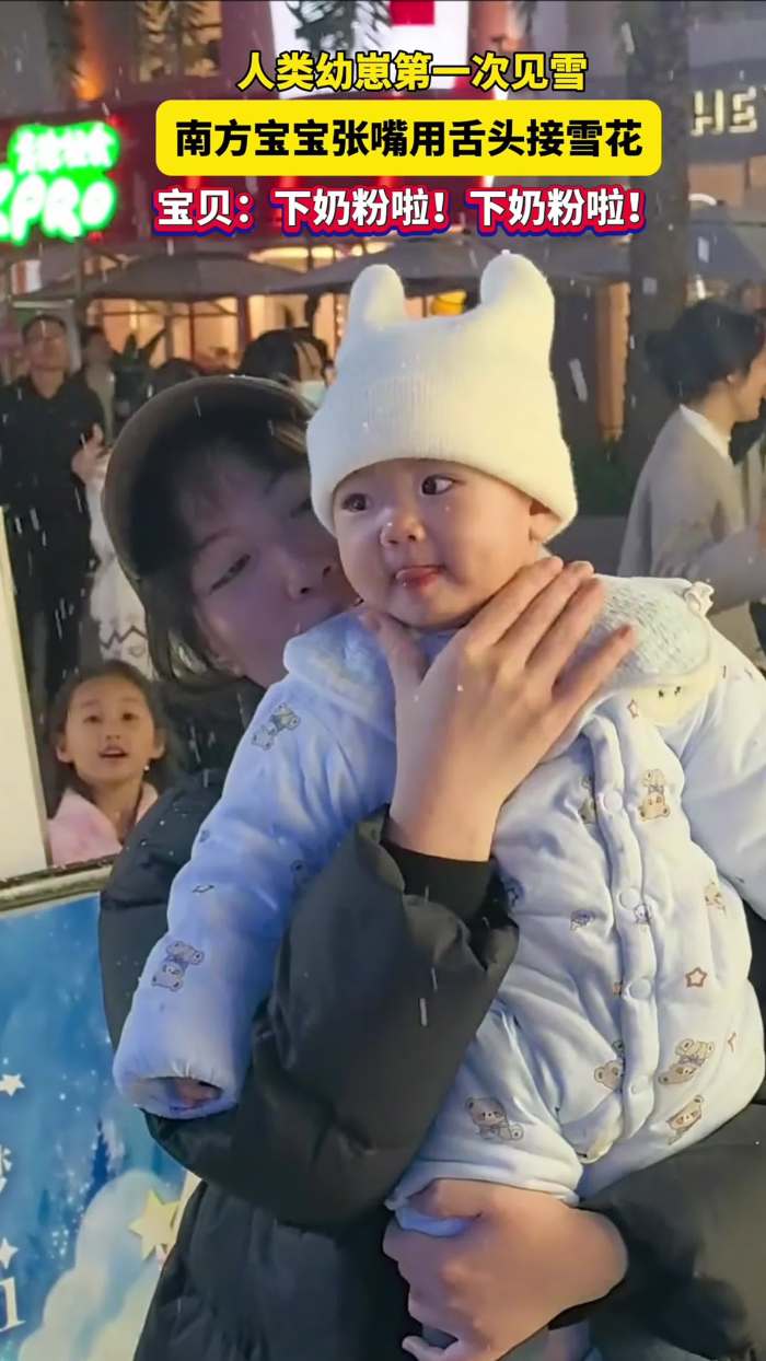 人类幼崽第一次见雪!南方宝宝张嘴用舌头接雪花!宝贝:下奶粉啦!下奶粉啦!