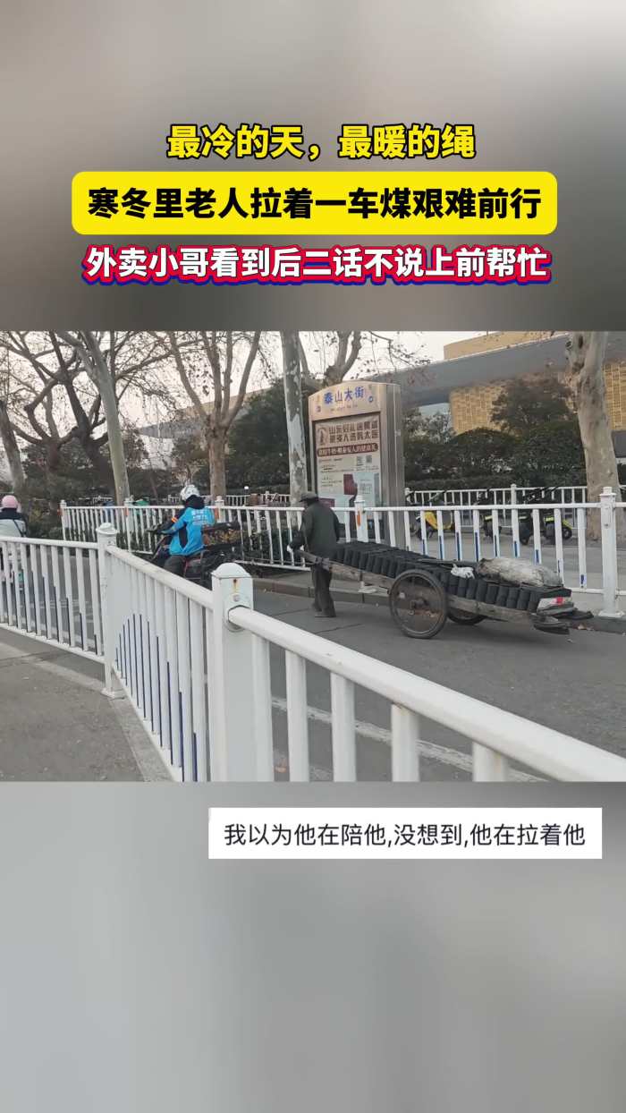 最冷的天,最暖的绳!寒冬里老人拉着一车煤艰难前行,外卖小哥看到后二话不说上前帮忙