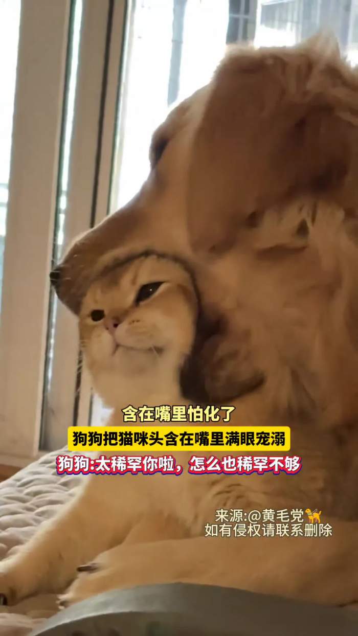 含在嘴里怕化了!狗狗把猫咪头含在嘴里满眼宠溺,狗狗:太稀罕你啦,怎么也稀罕不够