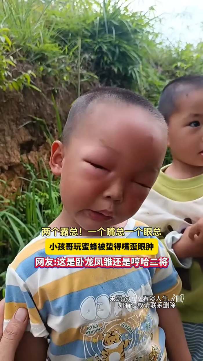 两个霸总!一个嘴总一个眼总,小孩哥玩蜜蜂被蛰得嘴歪眼肿,网友:这是卧龙凤雏还是哼哈二将